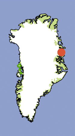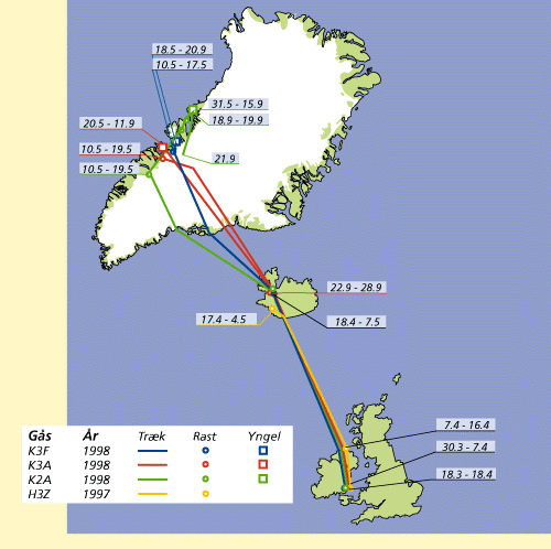 Trækruter for 4 grønlandske blisgæs med angivelse af raste- og ynglepladser. Ved at sætte satellitsendere på ryggen af gæssene har DMU-forskere fået bekræftet at denne relativt lille gåsebestand har vigtige rastepladser i Vestgrønland. |
