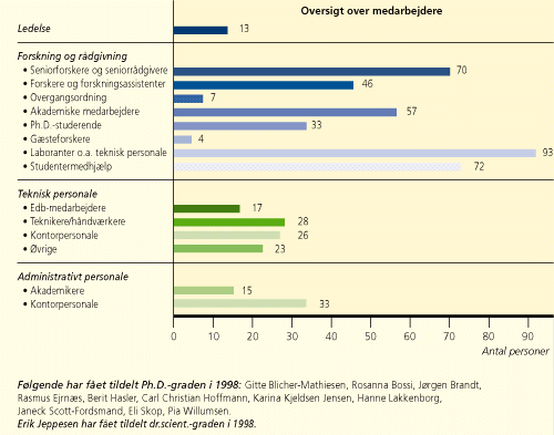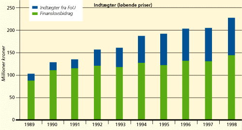DMUs indtægter beløb sig i 1998 til i alt 222 mio. kr., heraf 133 mio. fra finanslovsbevillingen og 89 mio. fra program- og kontraktforskning mv. DMUs driftsudgifter i 1998 udgjorde 221 mio. kr. ekskl. forrentning, afskrivning og refusionsberettiget moms. Driftsresultatet på 1,8 mio. kr. overføres til 1999. |