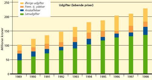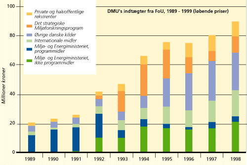 Målt i faste priser har DMUs finanslovsbevilling været nogenlunde uændret i perioden 1990-99. Man skal dog være opmærksom på at bevillingen kun er blevet opretholdt i kraft af tilgang af nye opgaver og hertil hørende bevillinger (vildtforskning, mikrobiologi, Grønlands Miljøundersøgelser). I den samme periode er de eksterne indtægter i form af program- og kontraktforskning tre- til firedoblet målt i faste priser. I 1998 udgjorde DMUs finanslovsbevilling 133 mio. kr. De eksterne indtægter udgjorde 89 mio. kr. Omsætningen blev således i alt 221 mio. kr., hvilket var en stigning i forhold til 1997.