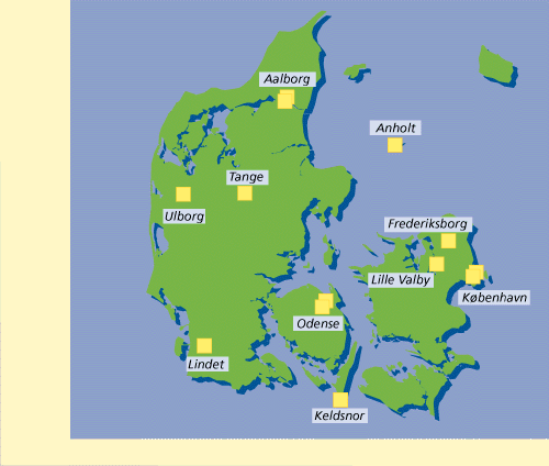 Kort over stationerne i DMUs luftmåleprogrammer. På DMUs hjemmeside (www.dmu.dk) kan man hente oplysninger om placering og måleprogram ved at klikke på stationerne. |