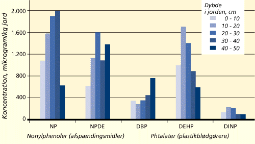 Fordeling af forskellige nonyl-phenoler og phthalater i land-brugsjord der er gødet med store mængder spildevandsslam (17 tons tørstof pr. år). |