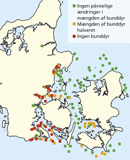 For at få hold på disse spørgsmål har DMU og amterne undersøgt havbunden i en række af de værst ramte områder i november og igen i marts. Forskerne valgte at tælle og veje dyrene i de almindeligste grupper som børsteorme, bløddyr, pighuder og krebsdyr. Der er normalt 2-300 tons bunddyr pr. kvadratkilometer på en rimelig rig havbund, men enkelte steder hvor der er mange blåmuslinger og molboøsters, kan der være mere end 1.000 tons pr. kvadratkilometer. Det svarer til 1.000 kg på en almindelig parcelhusgrund (1.000 kvadratmeter). Resultaterne viser at mængden af bunddyr ikke er berørt i områder med strøm, selv om der var iltsvind. Sådan var det fx i Storebælt. Omvendt er bunddyrene helt væk fra de dybe områder af blandt andet Vejle og Horsens fjorde og farvandene syd for Fyn, dvs. på dybder større end 10-20 meter. Herudover blev der set effekter i Smålandsfarvandet og Femer Bælt, hvor alvorlige iltsvind ellers er forholdsvis sjældne. Hvornår kommer dyrene så igen?