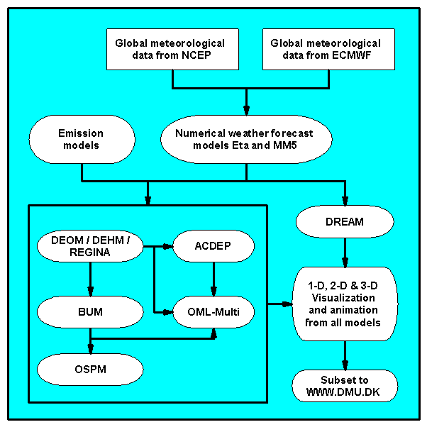 Global meteorological data is obtained from NCEP. These data are used as input to the Eta model, which calculates 3 days high-resolution regional weather forecasts. The weather forecast are then used in a series of regional and hemispheric air pollution models (DEOM, DREAM and DEHM). It will be possible in the future to run both the Eta (or MM5) and DEHM/REGINA as nested models with a finer resolution over a limited area as e.g. Denmark. The European air pollution background values calculated by DEOM are used as input to the urban background model (BUM) (currently for the cities of Copenhagen, Aalborg and Berlin), and the Operational Street Pollution Model (OSPM) for calculation of air pollution forecasts at street level in major cities (currently 11 streets in Copenhagen and 10 streets in Aalborg). Different visualization and animation tools in 1, 2 and 3 dimensions are applied for presentation of the output from all the models.